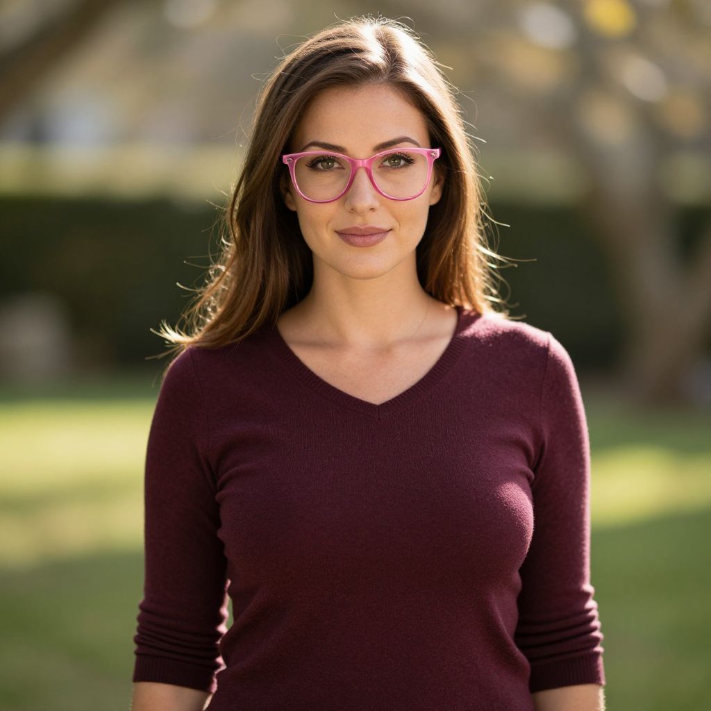 Photograph of a smiling woman with long brown hair, wearing pink-framed glasses and a dark purple V-neck sweater, standing in a sunlit,