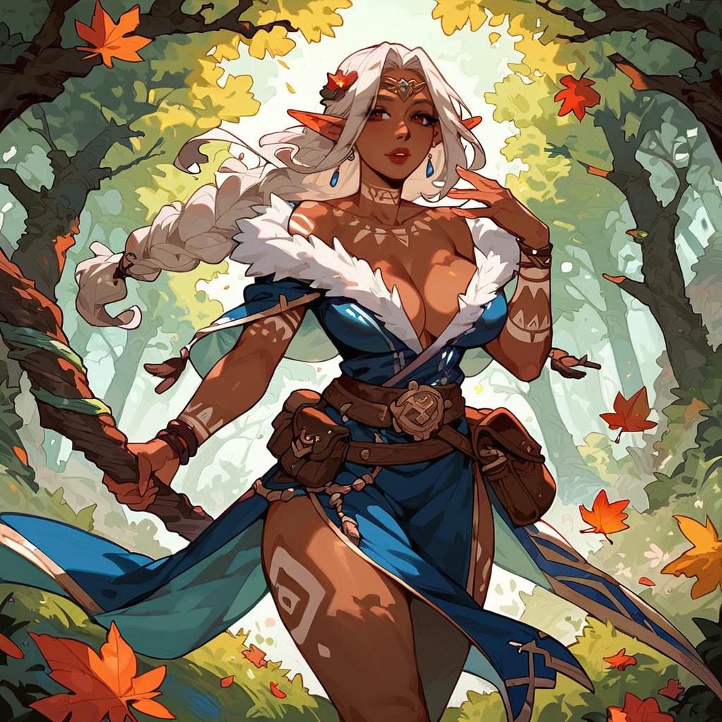 Score_9, score_8_up, score_7_up, dark-skinned female, elf, druid, white hair, red eyes, single braid, long hair, hair over shoulder, autumn leaves, forest, cleavage, robes, belt pouch, fur trim, magic glow, swirls, vines, flowers, dappled sunlight, staff, mature female, tribal tattoos