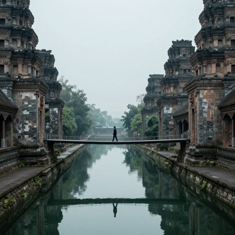 A solitary figure traverses a narrow stone bridge suspended over a serene, mirror-like chasm, where the ancient towers on either side seem to whisper secrets to each other across the void.