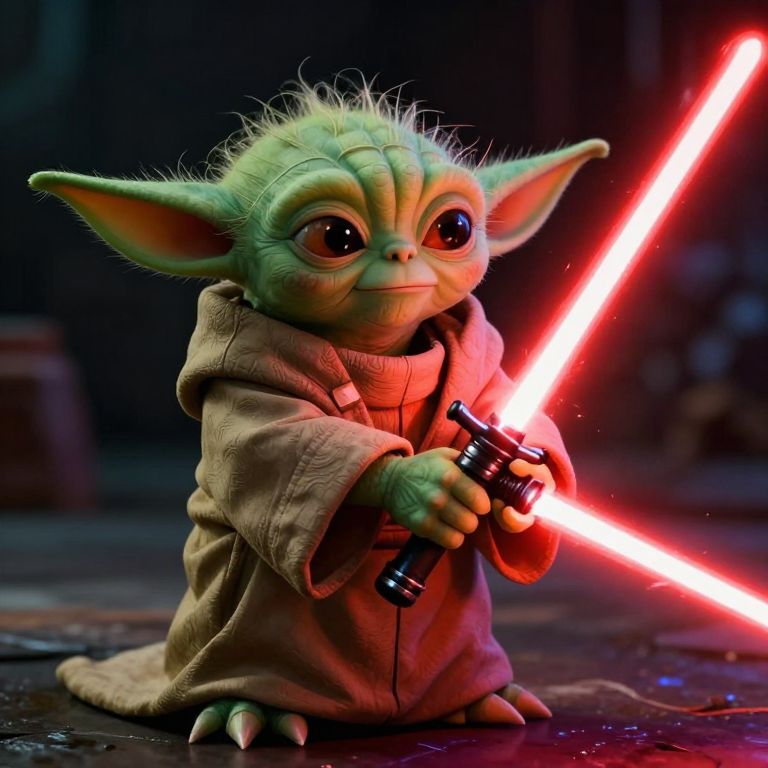 Photorealistic CGI image of a small, green, alien creature with large, expressive eyes, and spiky hair, resembling a young Yoda from Star Wars. It wears a beige, hooded robe and holds a glowing red lightsaber in both hands. The lightsaber's bright red light contrasts with the dark, blurry background. The creature's skin is textured, and its oversized ears are prominently displayed. The image has a realistic, high-detail style, emphasizing the character's cute yet fierce appearance. The lighting highlights the creature and the glowing lightsaber, creating a dramatic effect.