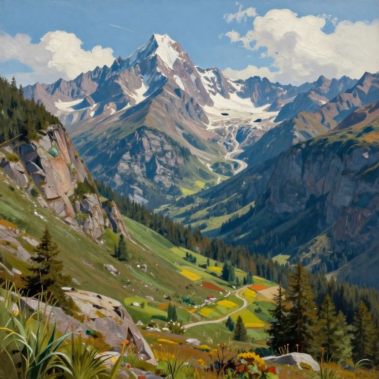 A vibrant illustration by Zsögödi Nagy Imre (1893-1976), titled \"In the Mountains\" from 1928, showcases a serene alpine landscape with rustic cabins nestled among lush greenery, towering cliffs, and distant snow-capped peaks, rendered in a vivid, hand-painted style that captures the tranquil beauty of the mountainous terrain.
