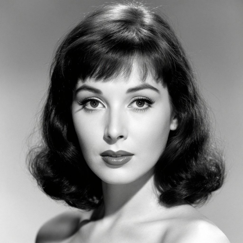 A portrait of a woman with classic cinematic glamour, styled with iconic Bettie Page bangs and softly curled shoulder-length hair. The black and white image emphasizes vintage elegance with dramatic lighting highlighting her facial features and smooth complexion.