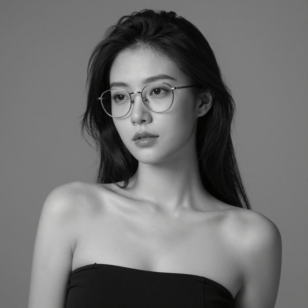 A black and white portrait of a woman wearing glasses and a strapless top, soft and subtle lighting, simple gray background, elegant and contemplative mood, realistic detailed facial features, studio shot