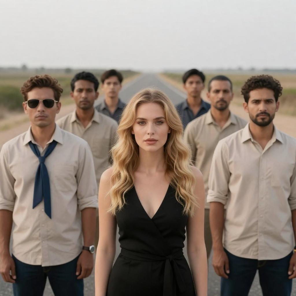 Three people standing indoors. A muscular man with dark hair and a goatee on the right, shirtless and wearing a gold necklace. A blonde woman in a black tank top with gold straps in the center. A man with short dark hair and a striped polo shirt on the left. Wooden door and bookshelf in the background. All with serious expressions.