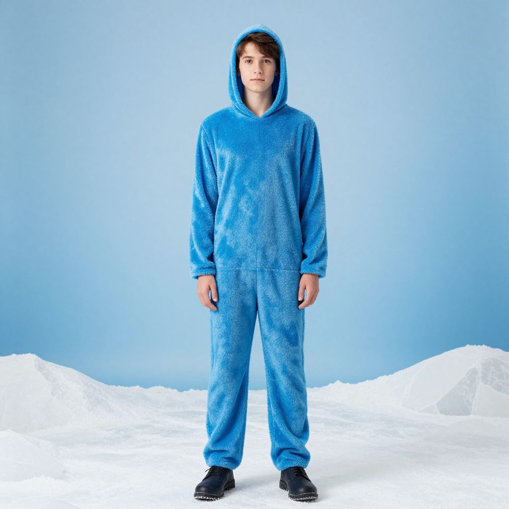 Ice themed party costume, 1boy, male focus, solo, hood, standing, hood up, ice, looking at viewer, full body, long sleeves, pants