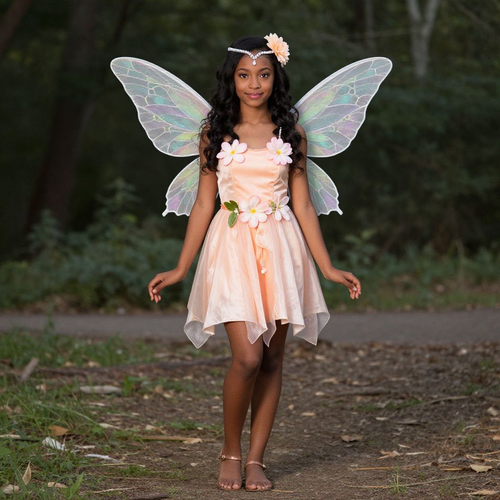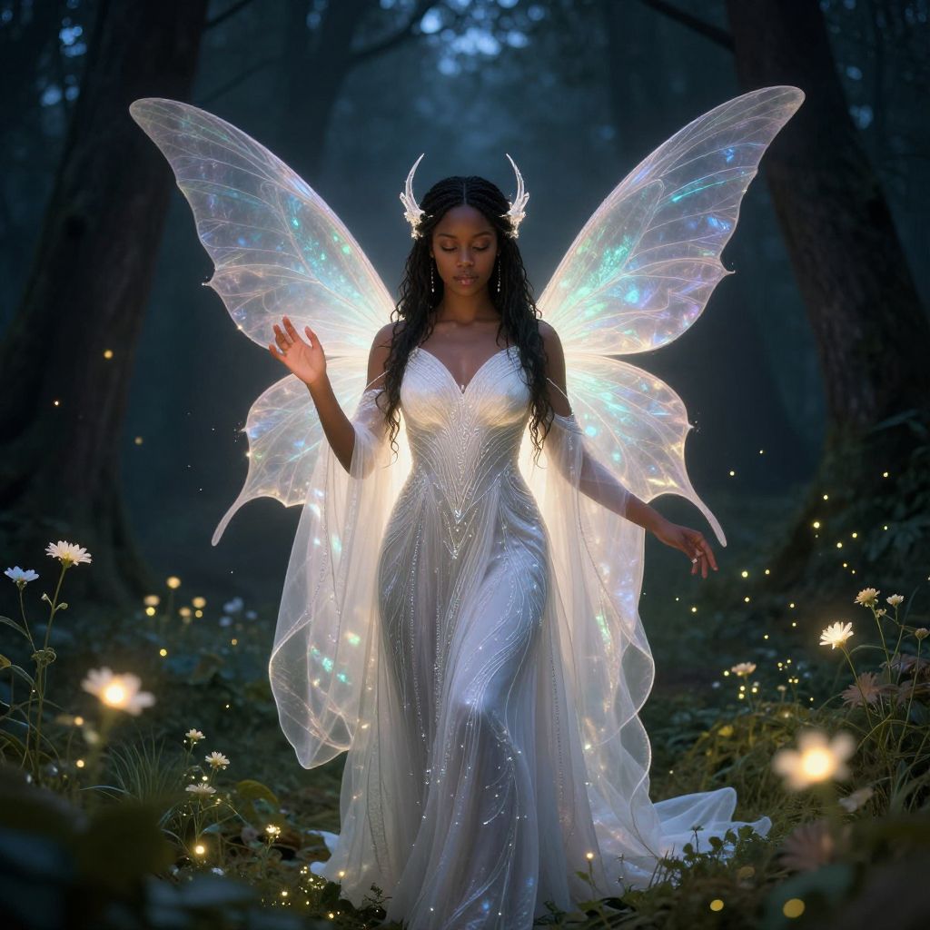 Adult white fairy costume, 1girl, wings, solo, dress, insect wings, outdoors, braid, looking at viewer, blurry background, fairy wings, dark skin, standing, blurry, see-through, dark-skinned female