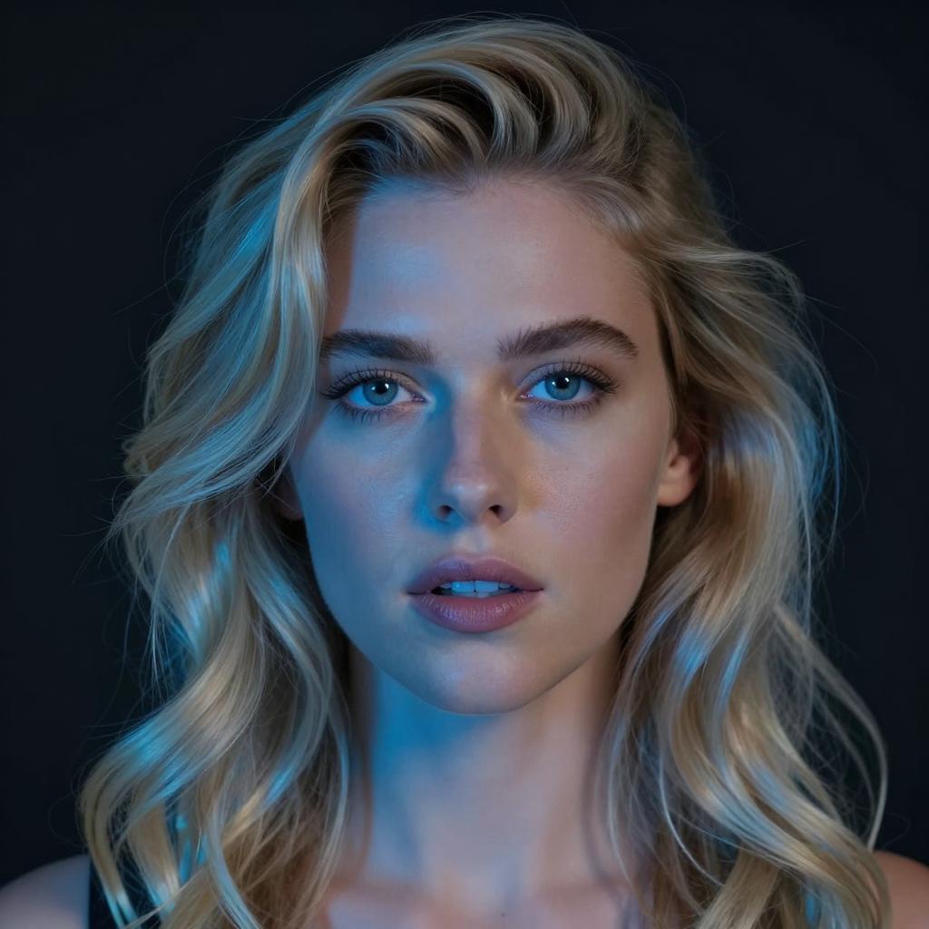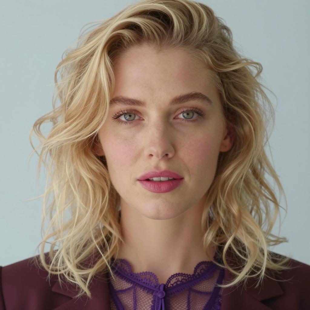 Close-up photograph of a blonde woman with curled hair, light skin, green eyes, and pink lipstick. She wears a purple lace-necked top and a maroon jacket. Her expression is neutral with slightly parted lips. Soft blue background.