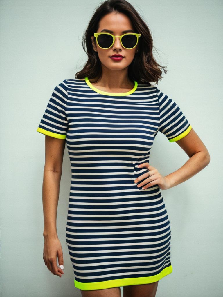 Woman, casual, navy and white horizontal striped short dress, neon yellow trim on neckline and sleeves, round neckline, short sleeves, fitted silhouette, above-the-knee length, black sunglasses. --sref 1399