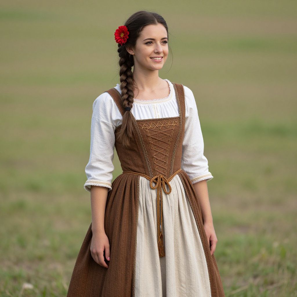 Photograph of a young woman standing in a grassy field. She has fair skin, dark brown hair in a single braid adorned with a red flower, and is smiling. She wears a traditional brown pinafore dress over a white blouse with puffed sleeves, featuring intricate embroidery on the brown bodice. The dress has a white apron-like skirt. The background is a blurred green field, suggesting a rural setting. The image has a soft, natural light, enhancing the serene, pastoral atmosphere. The woman's attire and hairstyle evoke a historical, folkloric style.