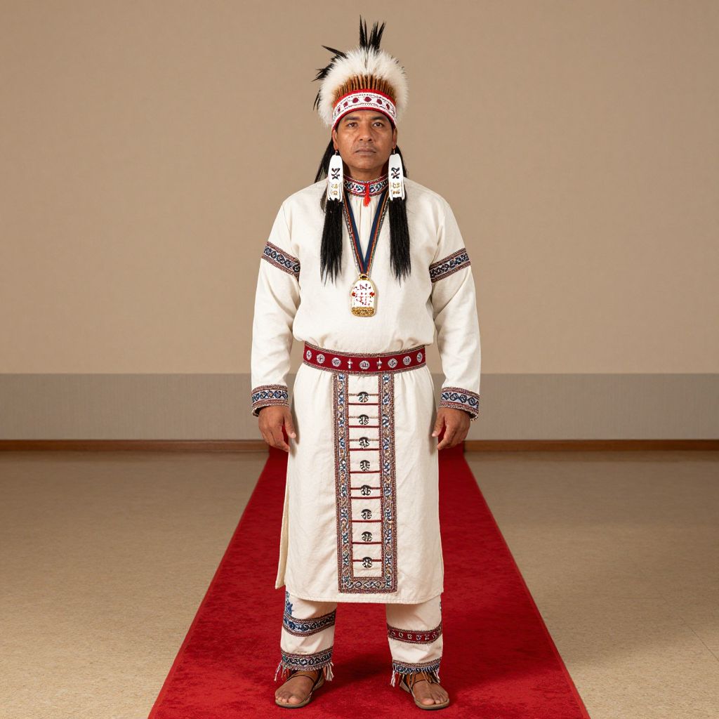 Native American Chief Costume, man in native dress standing in front of a red carpet