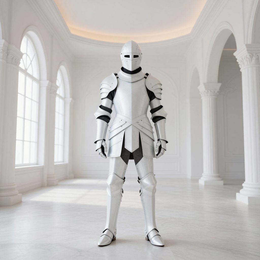 Photograph of a fully armored knight standing in a bright, white, classical-style room with arched windows and a circular ceiling light. The knight wears shiny, silver-colored armor with black accents, including a helmet with a faceplate, and stands with feet shoulder-width apart. The room's floor is white marble, and the walls are painted white, creating a stark contrast with the knight's armor. Soft, natural light filters through the arched windows, enhancing the room's elegant, architectural details. The overall image has a clean, minimalist aesthetic with a focus on the knight's imposing presence.