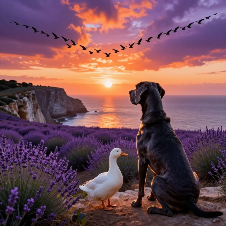 A majestic Great Dane with deep indigo-hued fur and floppy ears sits gracefully at the edge of a rugged cliff watching the sea at the French Atlantic coast, There is a pristine white duck standing next to the dog, The two companions are watching an enormous swarm of geese soaring in their signature V-shaped formation toward the glowing horizon, The V shape of the swarm is clearly contrasting against the bright sky, The setting sun paints the sky in a breathtaking array of colors, with hues of fiery orange, magenta, and deep purple blending into the dramatic, swirling clouds, The golden light highlights the dog's smooth, velvety fur, giving it an ethereal shimmer that complements its striking indigo color, Behind the Great Dane, a vast lavender field stretches endlessly, its vibrant purple blooms creating a stunning contrast to the dramatic coastal scenery, The calm sea below reflects the warm tones of the sunset, while the jagged, weathered cliffs emphasize the raw beauty of the untamed coastline, The perspective frames both the dog and the V-shaped swarm of geese as the central focus, with the vast, open landscape emphasizing their connection to the natural world, The hyper-realistic style captures every detail, from the individual lavender blooms swaying in the breeze to the textured fur of the dog and the intricate formations of the geese