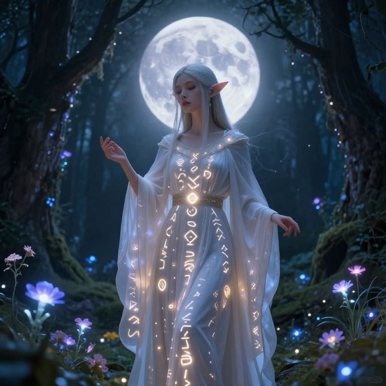Digital fantasy artwork: Elven woman with long silver hair, glowing runes on white robe, stands in enchanted forest under full moon, surrounded by glowing flowers
