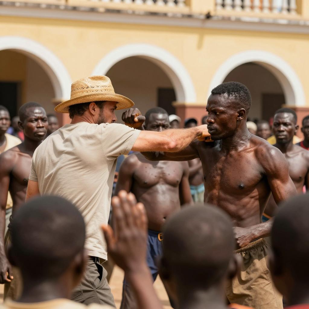 A crowded outdoor scene with a white man in a straw hat and beige shirt punching a muscular, shirtless black man with dark skin and a serious expression. Several other shirtless black men with visible bruises stand nearby. Yellow building with white arches in the background. Large crowd in the foreground, some reaching out. Sunlight casts strong shadows.