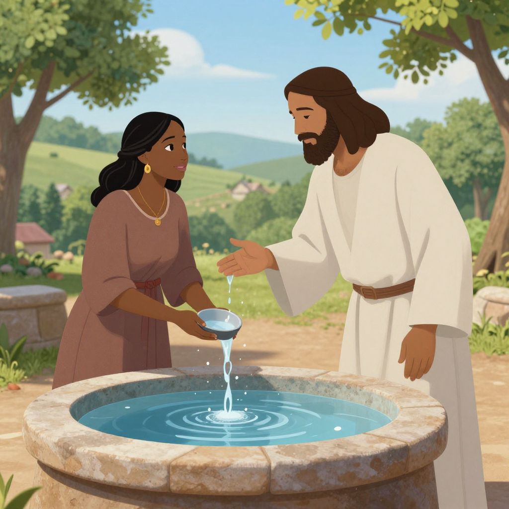 Digital illustration of a bearded man in white robes pouring water from a jug into a circular blue well, with a young girl in a white dress beside
