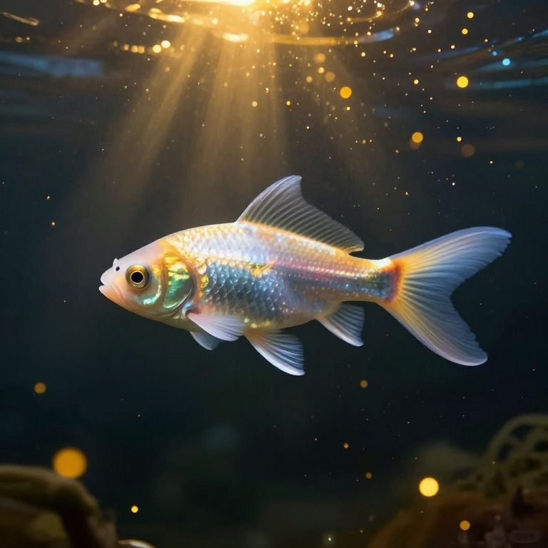 Photograph of a vibrant, silver fish with iridescent scales and orange accents on its fins and tail, swimming in dark underwater surroundings. Light rays from above create a radiant glow, illuminating the fish and sparkling around it. The fish's large, round eye is black, and its gills are visible. The background is a deep blue-black with scattered, glowing yellow particles, adding a magical ambiance. The fish's delicate, translucent fins and tail add a sense of motion and grace to the serene, underwater scene.