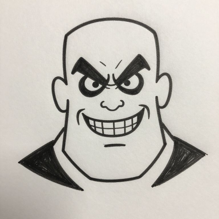 Beginner easy villain drawing of a classic comic book antagonist with exaggerated features, simple bold lines, and a mischievous grin, set against a plain background, perfect for novice artists learning character design and expression.