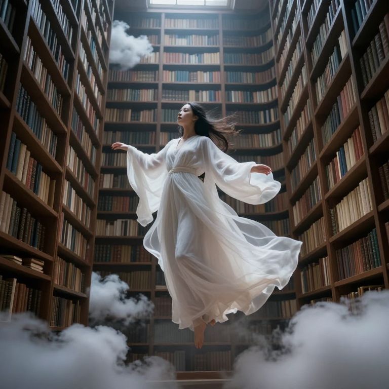 Translucent humanoid figures guide a woman through an ethereal library corridor lined with endless bookshelves, illuminated by floating golden lights and bathed in a serene glow as they interact with her amidst a surreal, story-infused atmosphere.