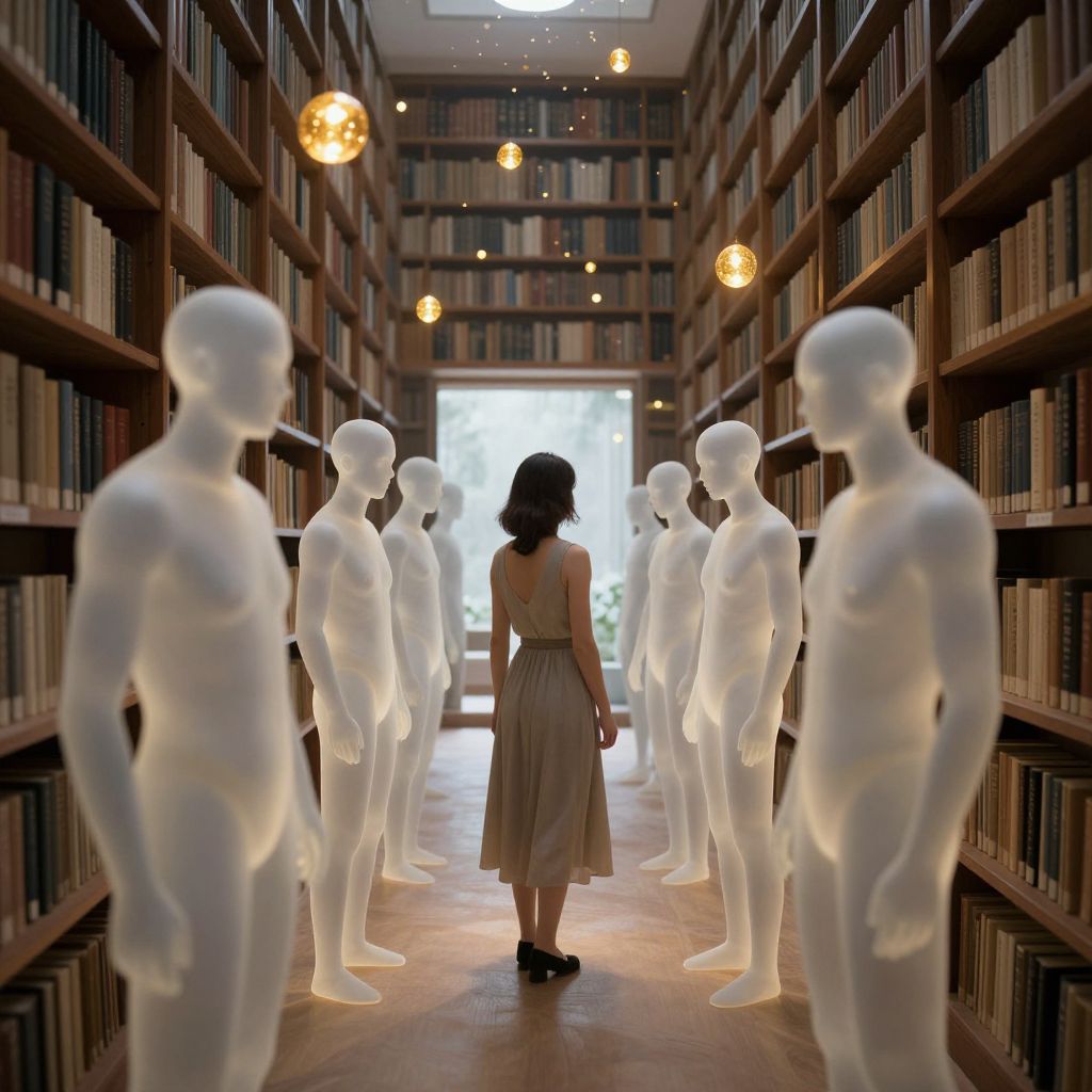 Photograph of a dimly lit library aisle with wooden bookshelves on both sides, filled with books. A woman with dark hair, wearing a sleeveless, knee-length, beige dress and black shoes, walks down the center, viewed from behind. She is surrounded by translucent, white, illuminated mannequin-like figures standing in a line. Warm, hanging orbs of light illuminate the scene, with a bright window at the end of the aisle. The atmosphere is surreal, blending reality with an ethereal, ghostly presence.