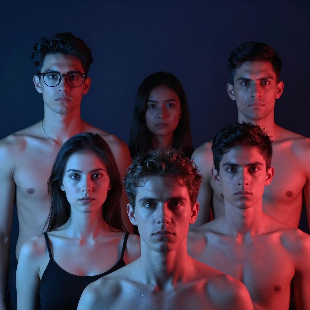 Six people with serious expressions, illuminated by blue and red lights. They stand close together, three in the front and three in the background. All are shirtless, with visible shoulders and upper chests. Glasses on the top left person. Short brown hair on the front right person. Dark hair on the back right person. Blue light on the left, red light on the right. Dark blue background.