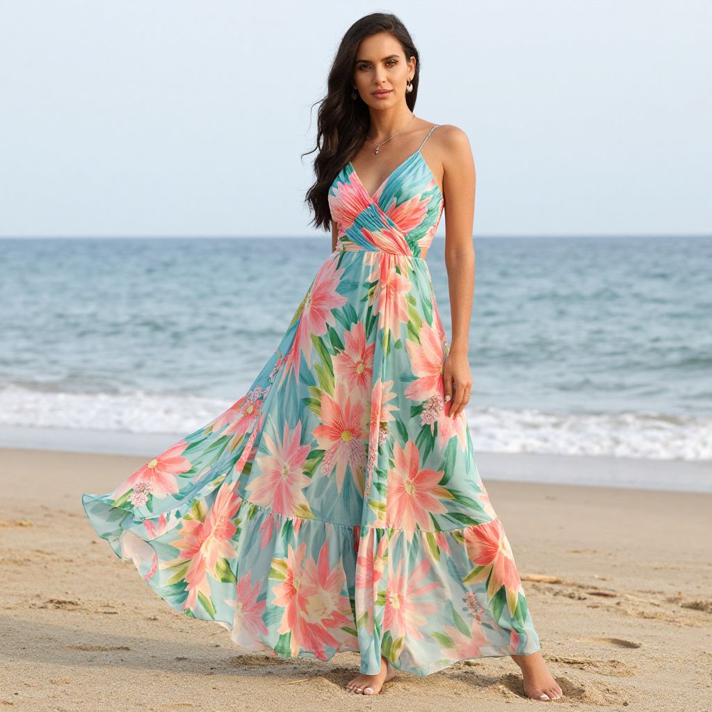 Woman wearing a vibrant floral sun dress stands gracefully on a sandy beach, her flowing chiffon dress adorned with pink and green patterns complementing the serene ocean backdrop.