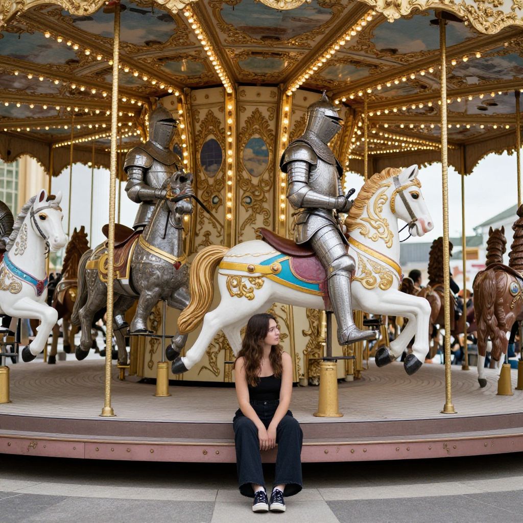 Ornate carousel horses, each ridden by colossal knights in armor, stand still beneath a golden canopy, while a solitary woman sits contemplatively on a checkered floor, her gaze fixed on the scene before her.