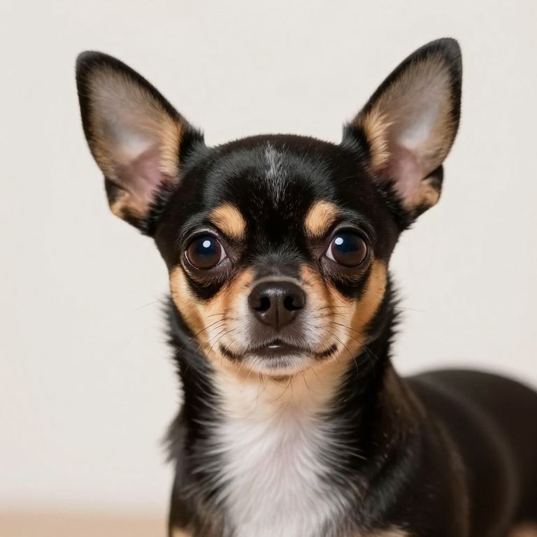 Photograph of a small black and tan Chihuahua with large, alert ears, and expressive, dark eyes. The dog has a white patch on its chest and a short, smooth coat. Its face is centered, staring directly at the camera with a slightly curious expression. The background is a plain, bright white, which makes the dog's features stand out prominently. The image is sharply focused, capturing the fine details of the Chihuahua's fur and facial structure. The overall composition is simple, emphasizing the dog's cute and attentive demeanor.