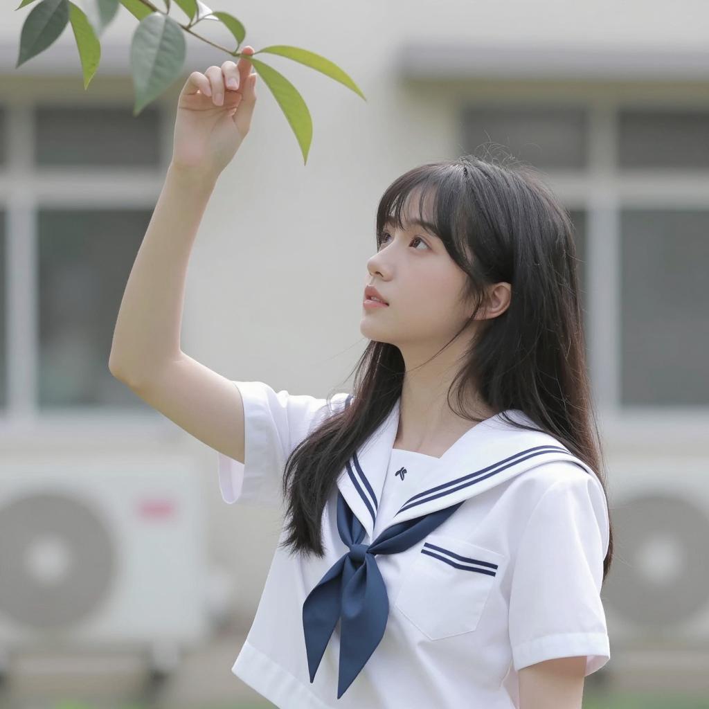 Young Asian woman with long black hair, wearing a navy blue sailor uniform with white stripes, raises her right hand to touch her hair. Bright blue sky background. She has fair skin and a slight smile. Her face is in profile. Her right arm is raised, covering part of her forehead.