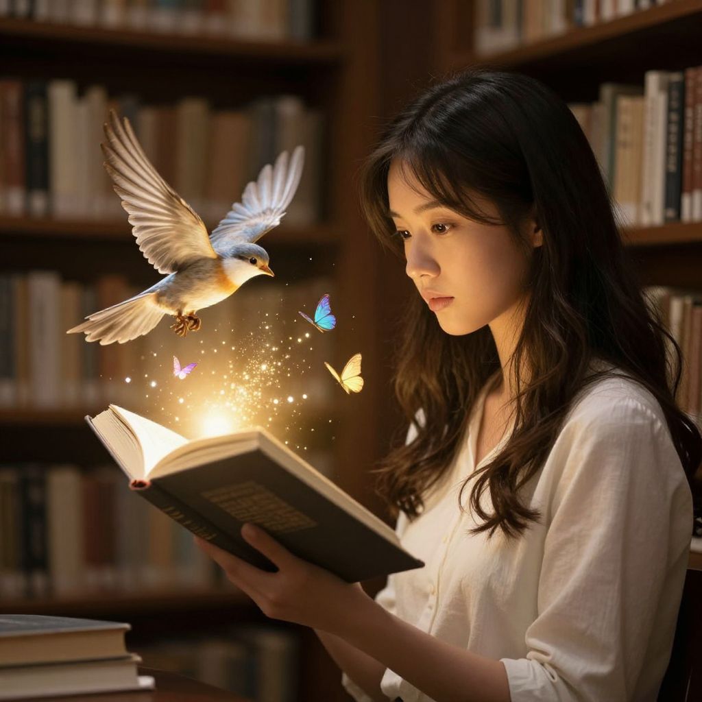 In a serene library, a young woman engrossed in reading holds an open book that emits golden light, as a bird takes flight from its pages, surrounded by shimmering butterflies, symbolizing the magic of literature.