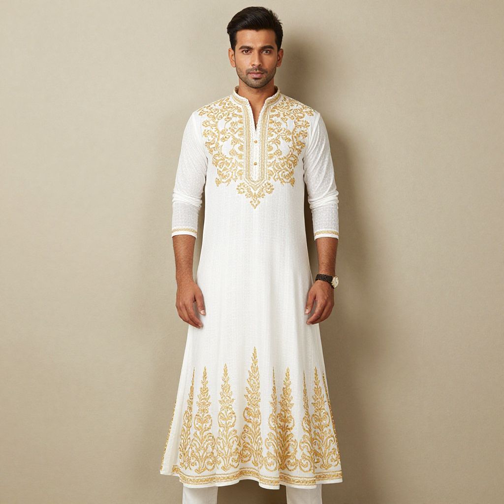 "Trendy Indian Dress, a man in a white and gold outfit standing in front of a wall"