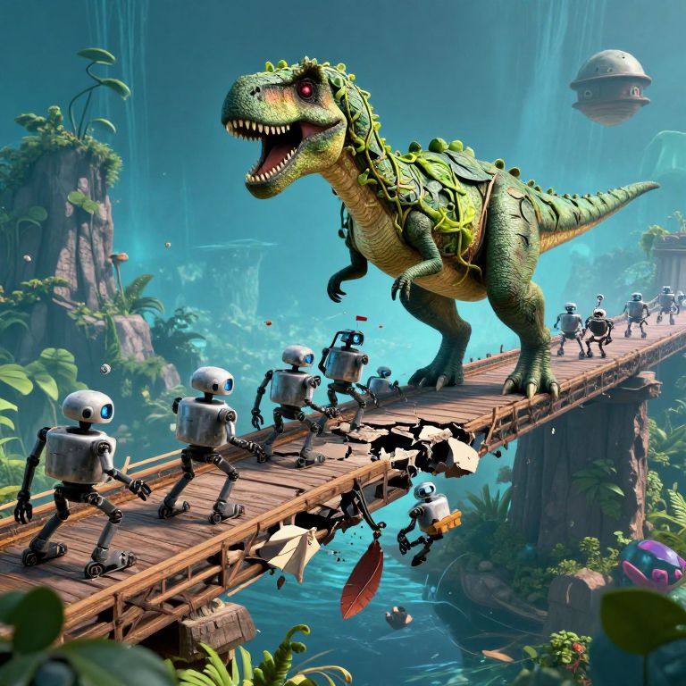 An army of sentient swarm-bots collaborates with a vine-covered dinosaur to rebuild a crumbling bridge between the physical world and the quantum realm.
