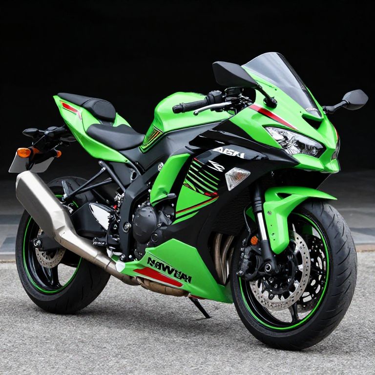 Photograph of a vibrant green Kawasaki sport motorcycle with black and silver accents, sharp angles, and aggressive stance, parked on a gray asphalt surface against a