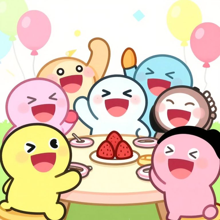 Colorful cartoon chibi characters with round heads and big smiles, celebrating around a table with strawberries, balloons, and a sunny background. Digital art.