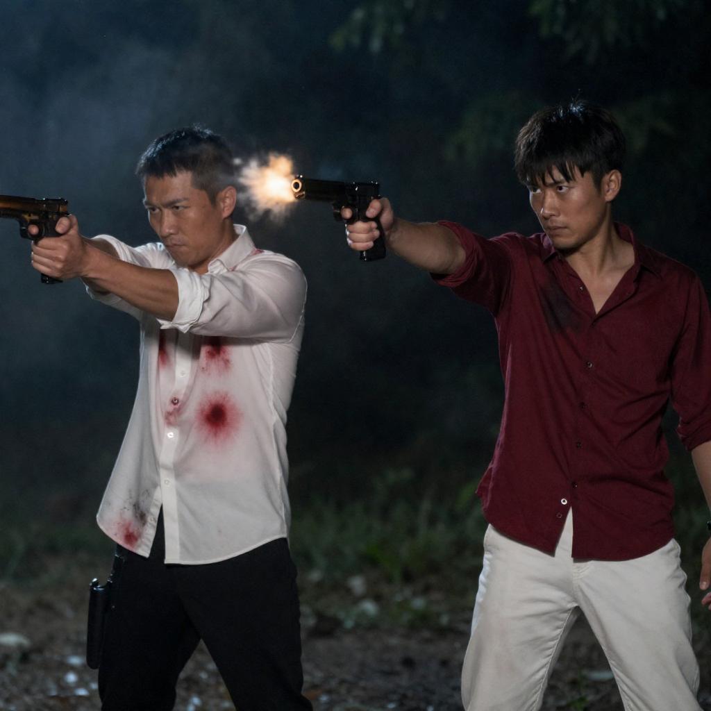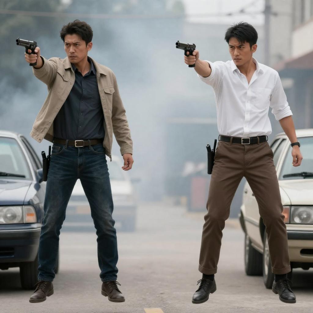 Two men in a dynamic shootout, one in a beige jacket, the other in a white shirt and brown pants, both pointing guns. Background: smoke, two parked cars, urban street setting. Both men mid-air, intense expressions.