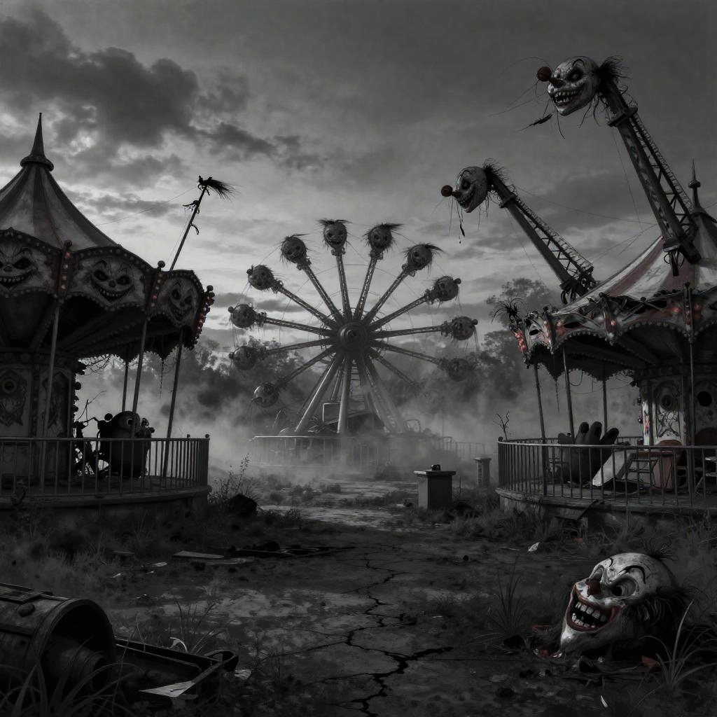 Spooky drawings depicting a deserted carnival at dusk, broken rides creaking in the wind, clown faces twisted into sinister grins, mist rolling over cracked pathways, use of chiaroscuro for a moody, unsettling effect, detailed and atmospheric.