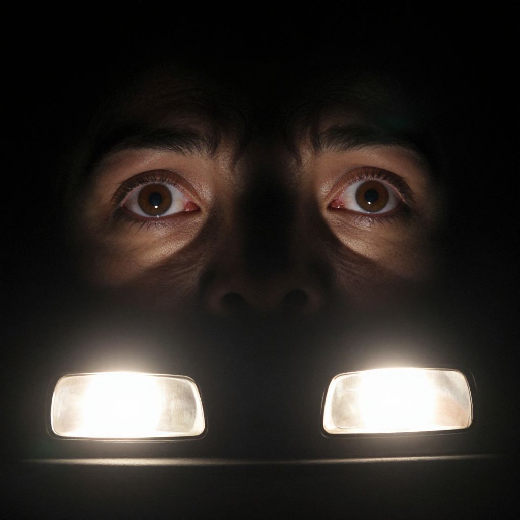 Photograph of a man's intense brown eyes, centrally framed against a black background. His eyes are wide open, reflecting light from two bright, rectangular headlights positioned at the bottom of the image. The headlights are white, with a slight yellowish glow, contrasting sharply with the dark surroundings. The man's skin is slightly visible around his eyes, with subtle shadows enhancing the expression of alertness and focus. The photograph emphasizes the dramatic contrast between light and darkness, creating a sense of mystery and anticipation.