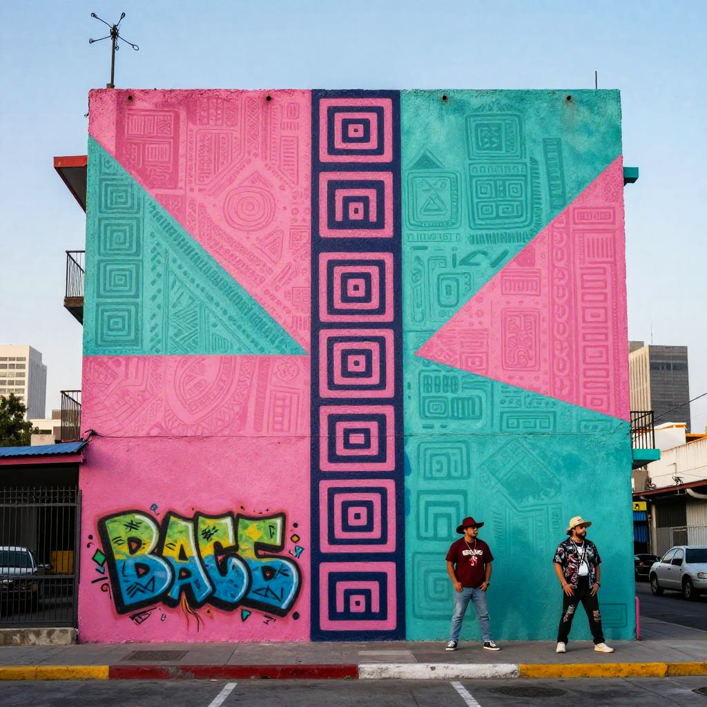 Mexican 80s style urban mural, bold geometric shapes combined with indigenous patterns, electric pink and turquoise palette, graffiti artists in vintage streetwear, city skyline at dusk