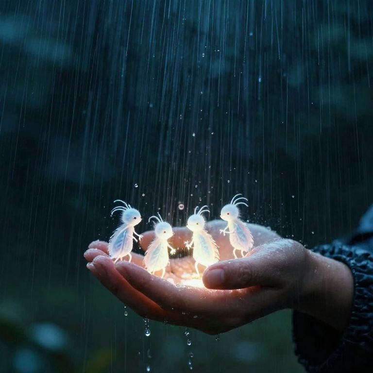 Photograph of a hand in rain, glowing white fairy-like creatures surrounding a bright, illuminated center, dark blurred background.