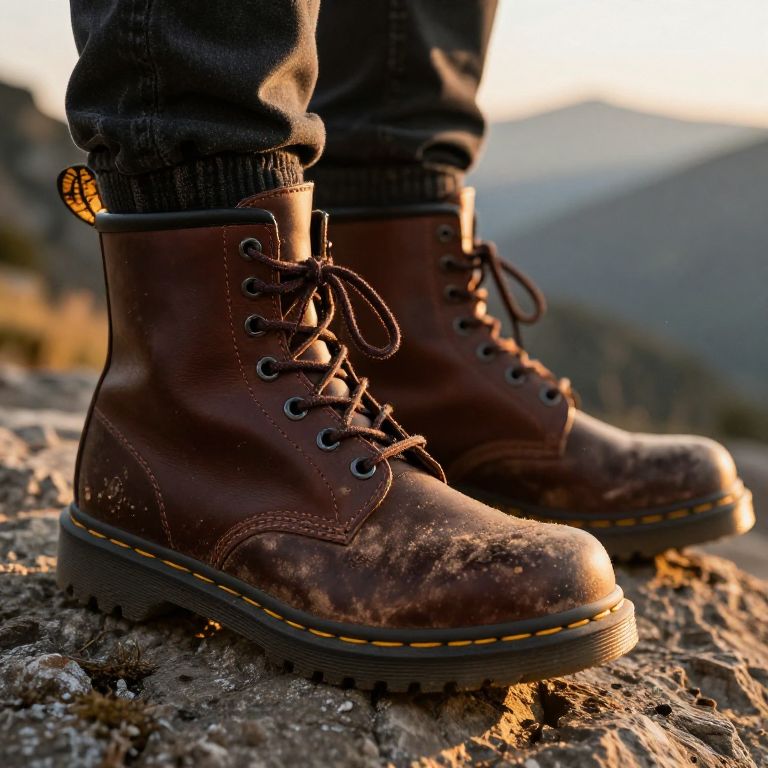 DocMart sturdy boots in a rugged mountain landscape, worn leather textures, detailed laces, dust and dirt, warm sunset lighting highlighting the craftsmanship, realistic style with high contrast shadows and depth