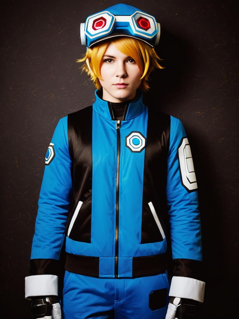 Man cosplay. Wearing Beck (Mighty No. 9) costume. Realistic photo. Dressed as Beck (Mighty No. 9) --sref 1399