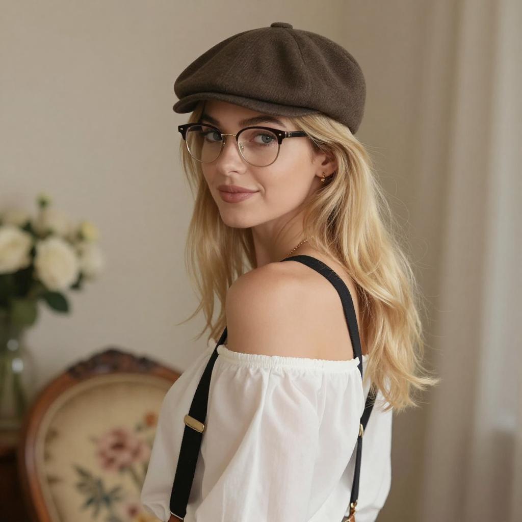 Blonde Woman Adjusting Brown Flat Cap