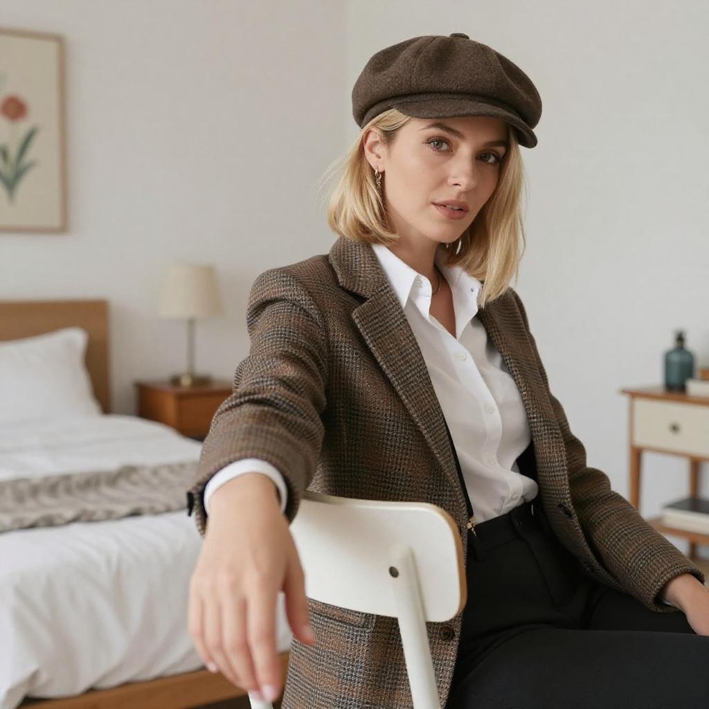 Photograph of a blonde woman with bangs, wearing a brown flat cap, glasses, a brown plaid jacket, white blouse, black strappy top, black skirt, and black tights. She stands in a brightly lit room, leaning against a white chair, adjusting her hat with both hands.