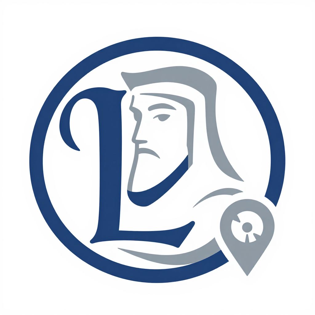 Medieval Portrait plain vector elegant and modern logo that contains a hand and the letter L, blue and grey colors, geo marker, white background, horizontal orientation, landscape orientation,