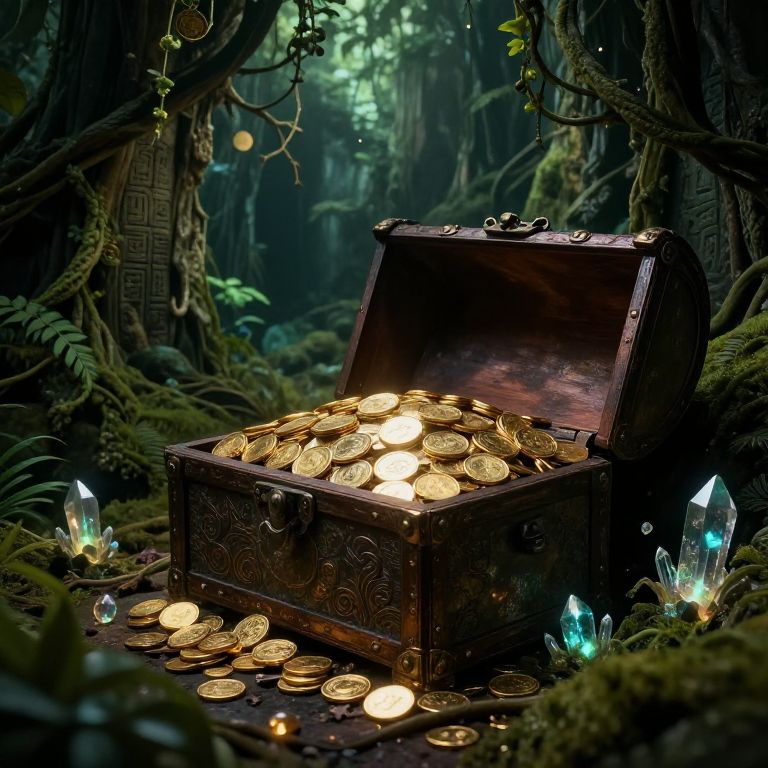 Photorealistic digital artwork of an ornate treasure chest overflowing with glowing coins, surrounded by bioluminescent crystals in a dense, mystical forest.