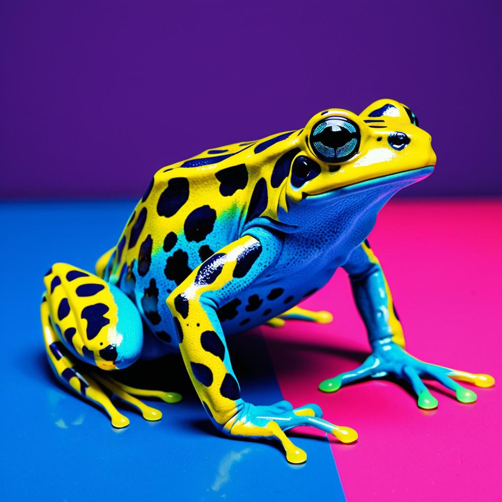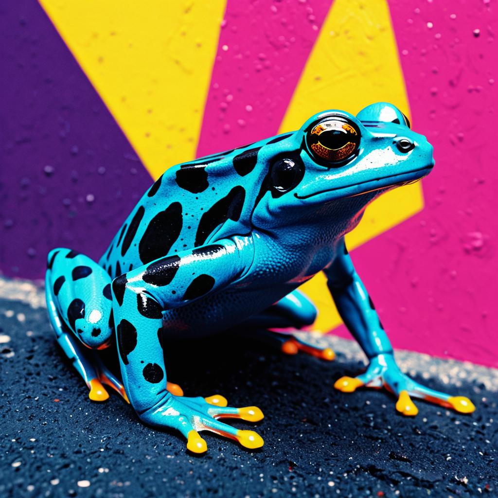 Close-up of a neon blue dart frog with black spots and bright orange toes, set against a vibrant, high-contrast pop art graffiti background featuring bold yellow, pink, and purple colors. The image showcases a sleek, modern, and edgy design inspired by the pop art movement.