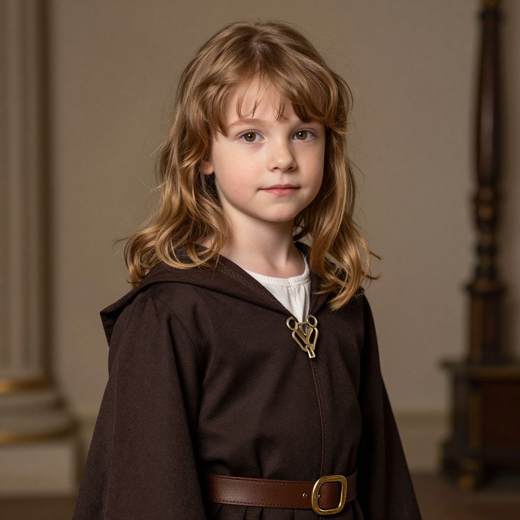 Photograph of a young Caucasian girl with light brown, wavy hair and bangs, wearing a black hooded cloak with a brown belt and white shirt underneath. She has fair skin and a slight smile, looking directly at the camera. The background is blurred, featuring beige walls and a tall, dark wooden column on the right. The lighting is soft, highlighting her face and creating a warm, gentle atmosphere. The image has a slightly vintage, classic feel, reminiscent of a historical or fantasy setting.