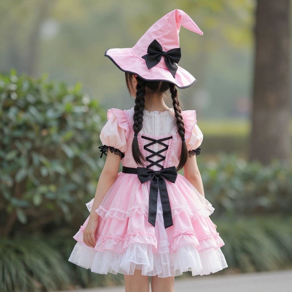 Photograph of a young girl with long black braids, seen from behind, wearing a pink witch costume. Her outfit includes a pink, puffed-sleeve dress with white lace trim, black criss-cross laces on the back, and a large black bow at the waist. She also wears a pink, pointed witch hat adorned with a black bow. The background shows a blurred, green outdoor setting with bushes and trees. The image has a soft focus, emphasizing the girl's costume against the natural background.