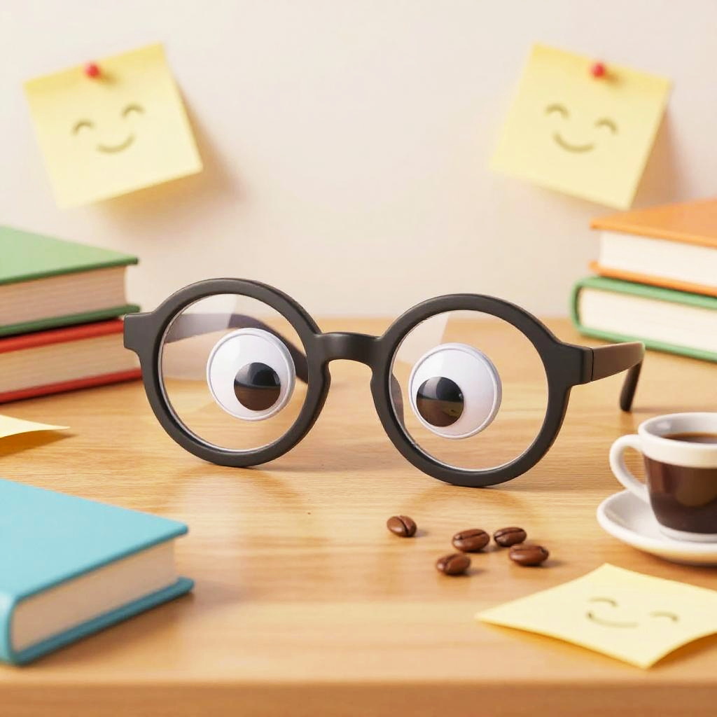 Reading glasses funny concept showcasing a pair of animated reading glasses with googly eyes on the lenses, dancing on a wooden desk cluttered with scattered books, spilling coffee, and humorous sticky notes in a bright, cartoonish style.