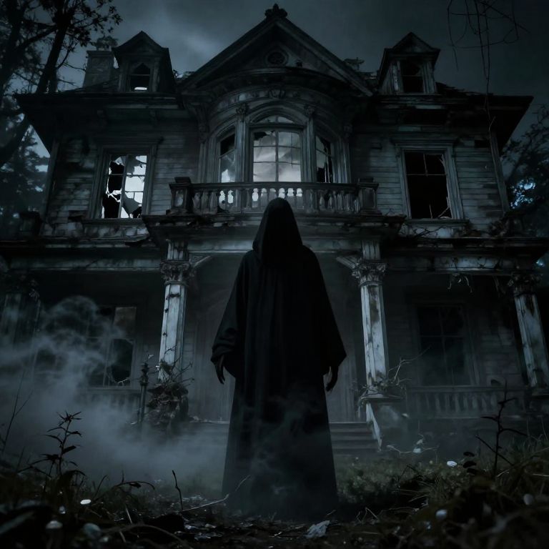 A dark, atmospheric digital illustration depicts a mysterious figure in a long, hooded cloak standing in front of a dilapidated, haunted mansion. The mansion, with broken windows and peeling paint, emits a eerie blue glow from within. Fog swirls around the overgrown, deserted front lawn. The figure, shrouded in darkness, stands at the mansion's entrance, creating a sense of suspense and foreboding. Trees frame the scene on either side, enhancing the spooky, isolated atmosphere. The image uses deep blues and blacks to emphasize the night-time setting.