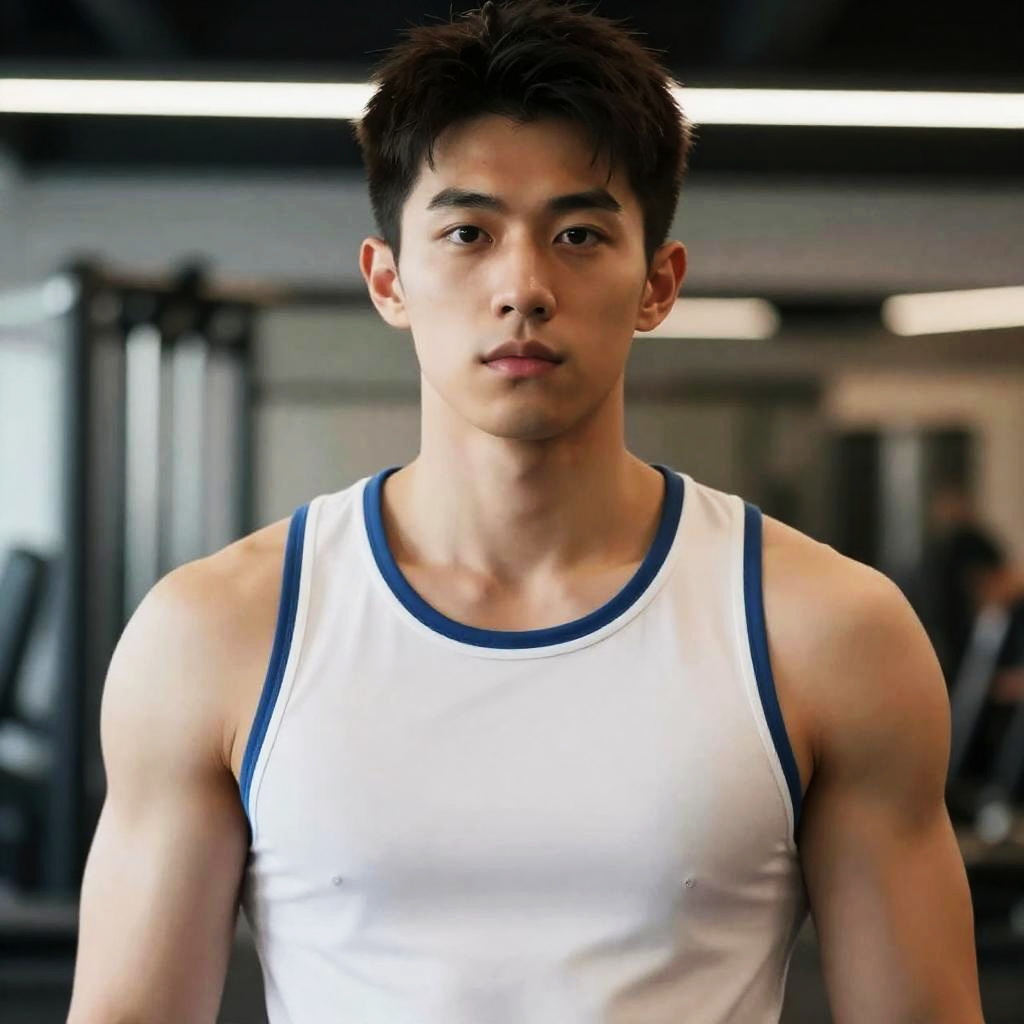 Photorealistic bust shot of a young Asian man standing in a gym, wearing a white tank top with blue trim. The man has short dark hair and a serious expression, with a blurred gym background featuring exercise equipment.